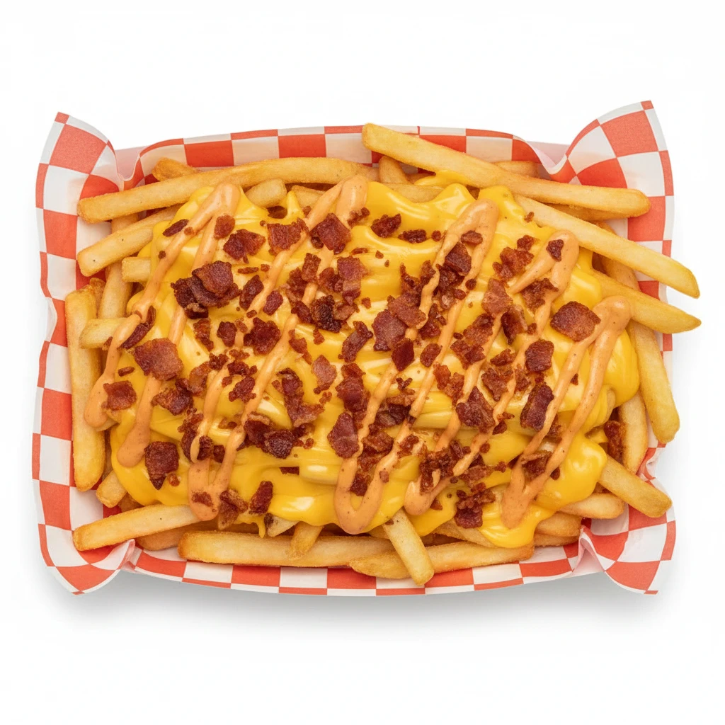 Papas fritas cubiertas con queso derretido, tocino crujiente y salsa especial de la casa.