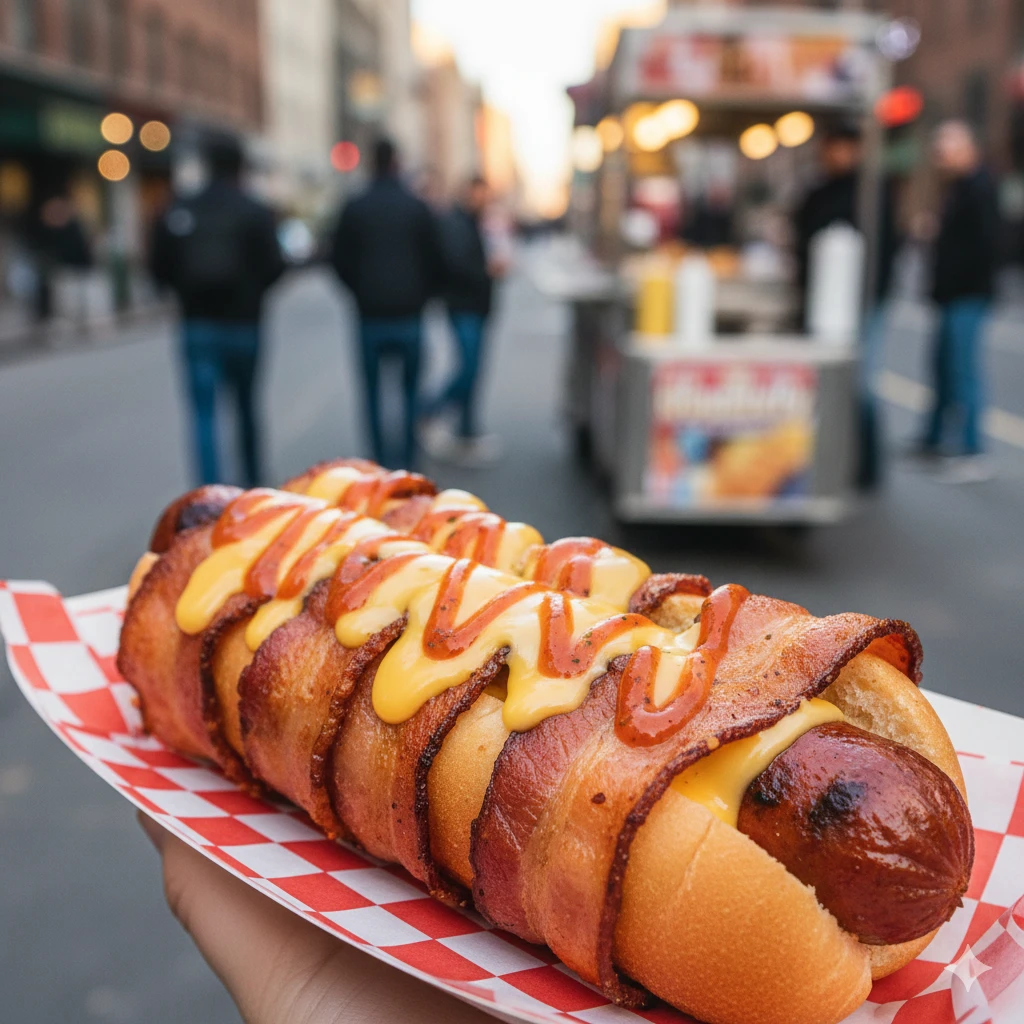 Jugoso hot dog de res envuelto en tocino crujiente, con queso derretido y salsa especial de la casa.