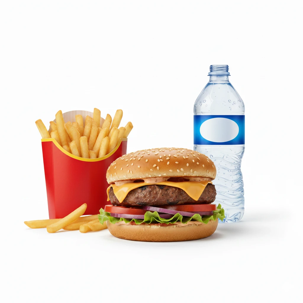 Hamburguesa clásica de res acompañada de papas fritas crujientes y bebida refrescante. El combo perfecto.