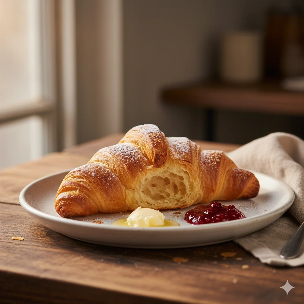 Croissant recién horneado, crujiente por fuera y suave por dentro.