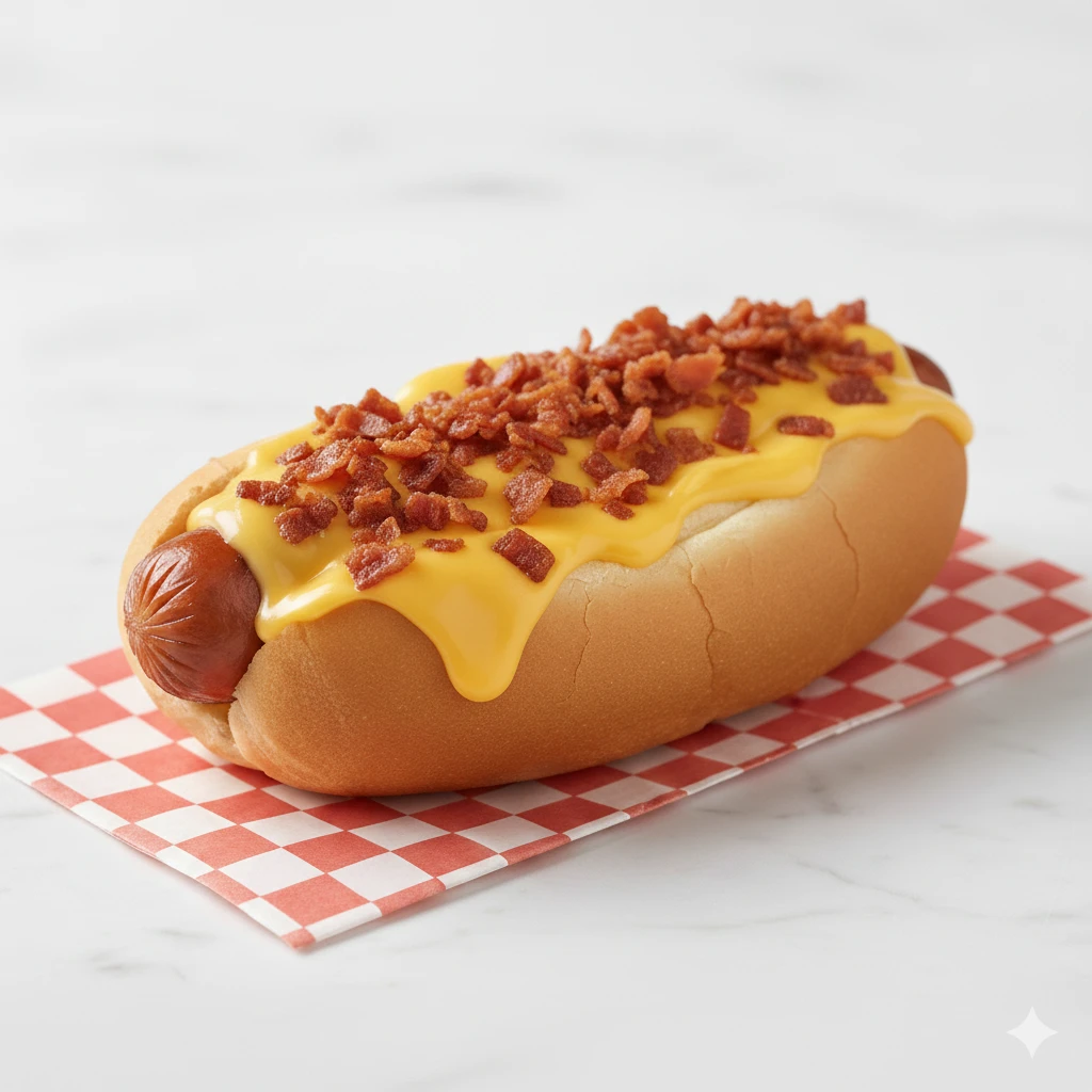 Hot dog cubierto con queso derretido y tocino crujiente.