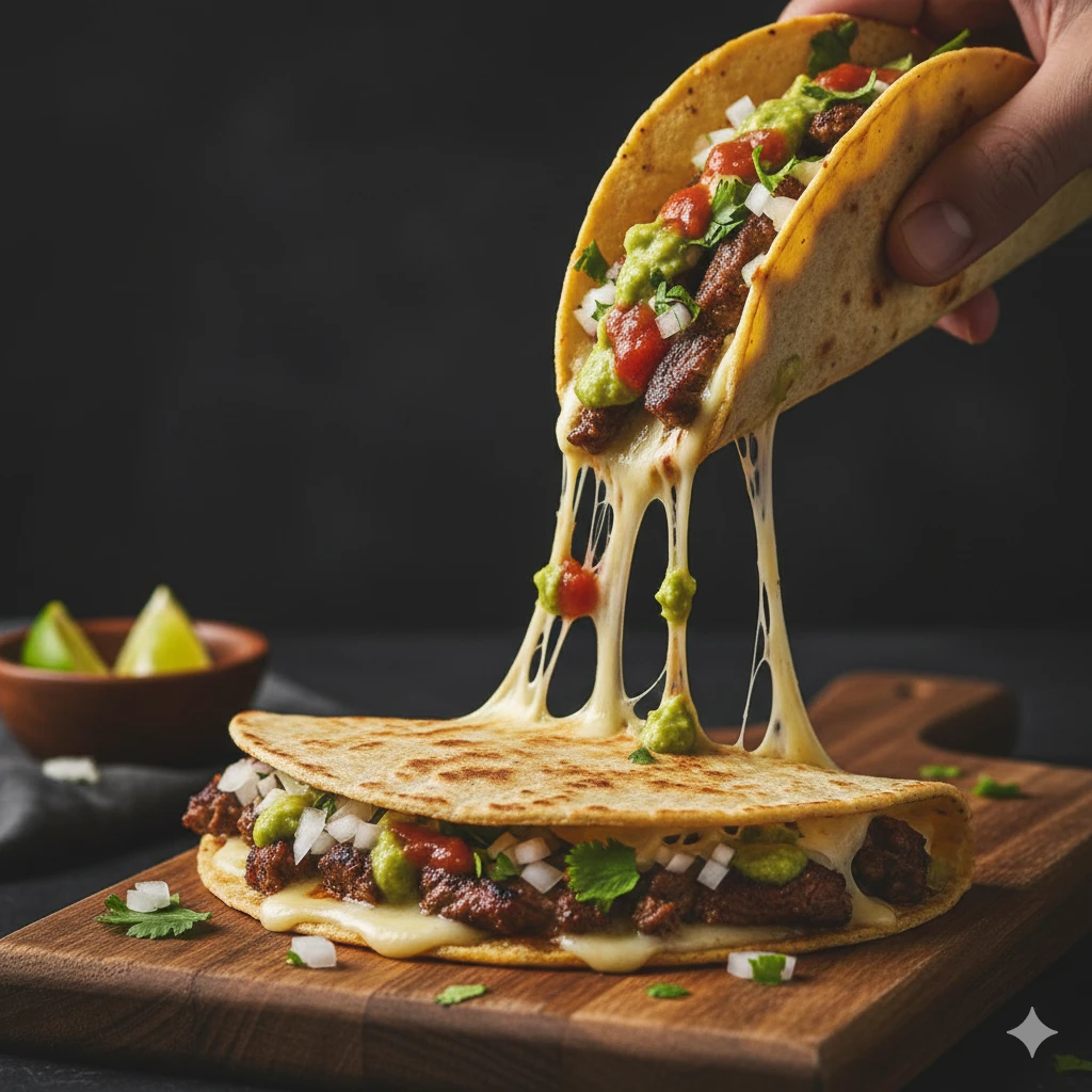Clásica quesadilla mexicana preparada con tortilla de harina caliente y rellena con abundante queso derretido. Ideal como snack o comida ligera.