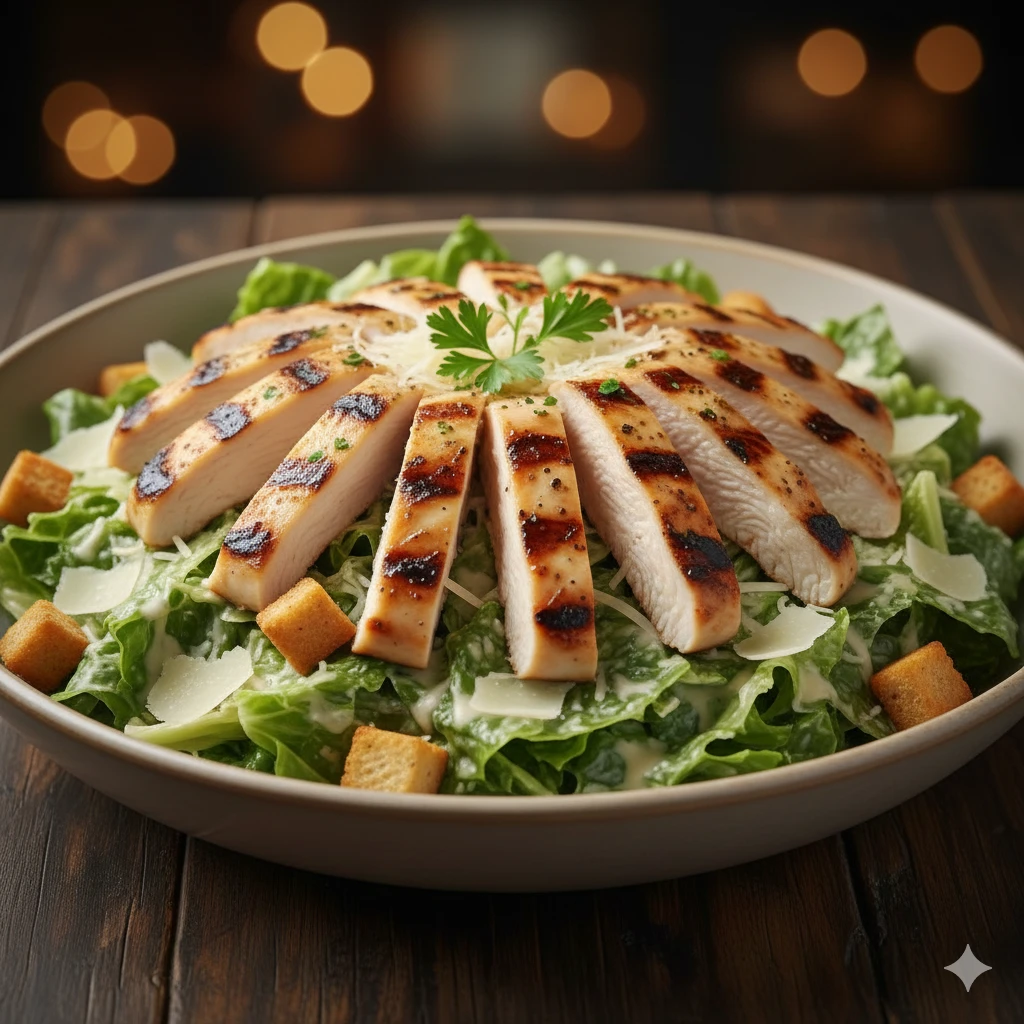 Pechuga de pollo a la parrilla servida sobre lechuga romana fresca, aderezo césar, crutones y queso parmesano.