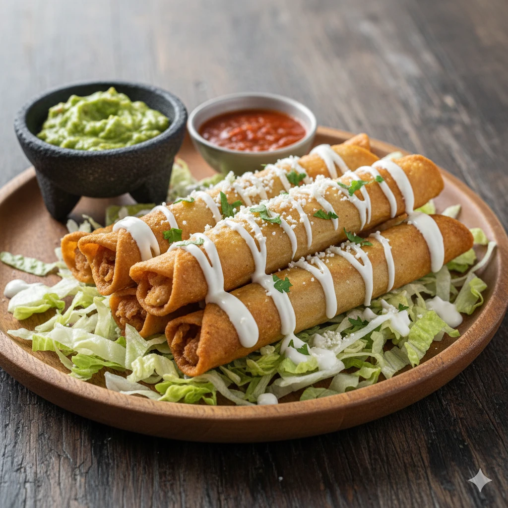 Tacos de pollo a la parrilla con lechuga fresca, queso y salsa cremosa.