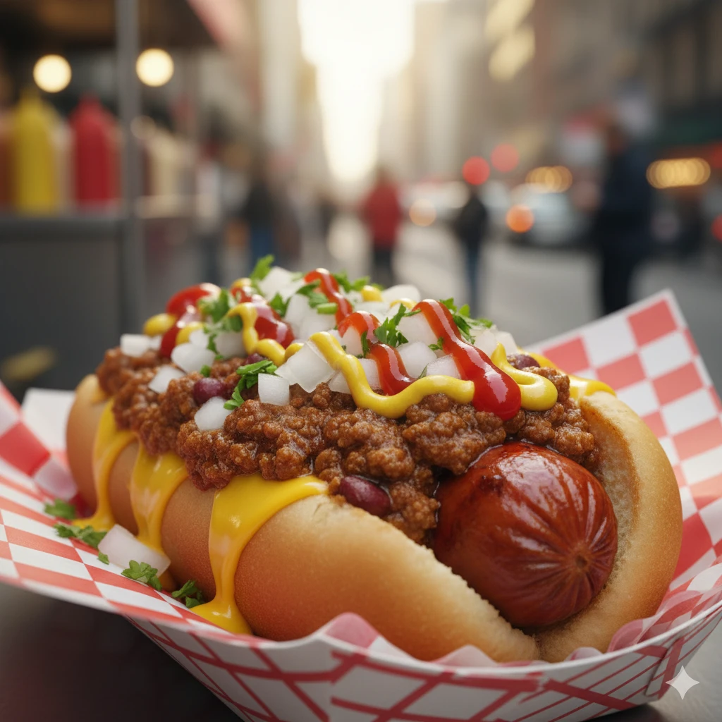 Hot dog de res cubierto con chili con carne casero, queso derretido y cebolla fresca. Un clásico callejero lleno de sabor.