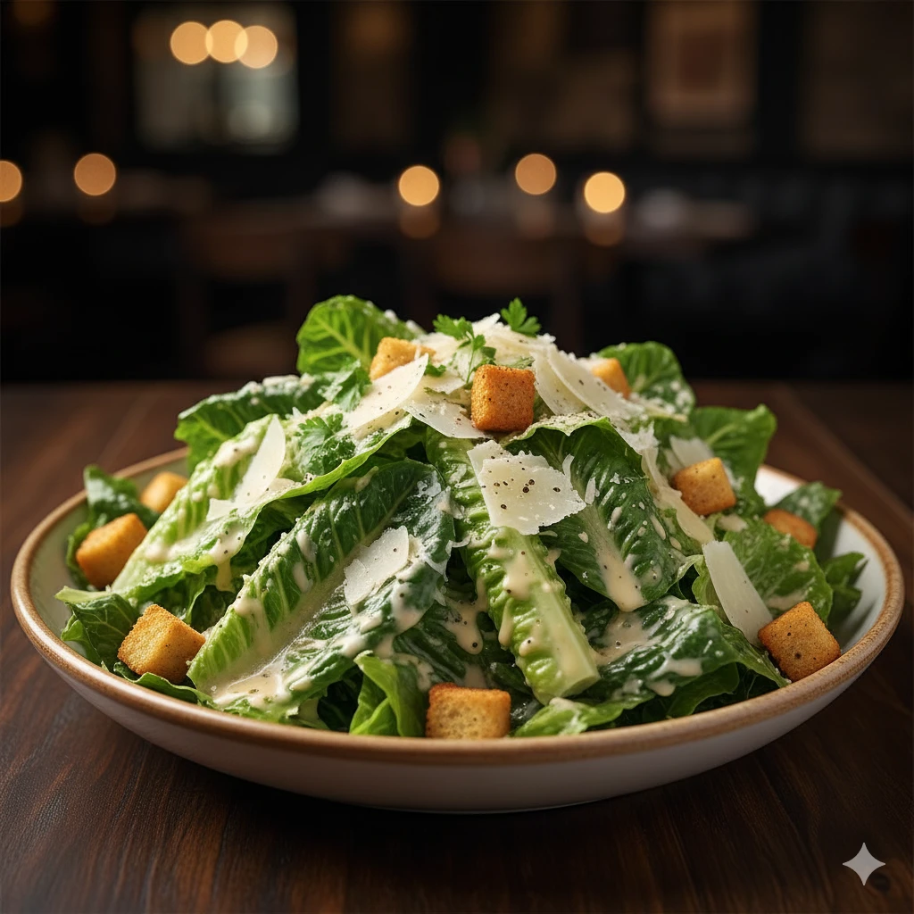 Lechuga romana fresca mezclada con aderezo césar cremoso, crutones crujientes y queso parmesano rallado.