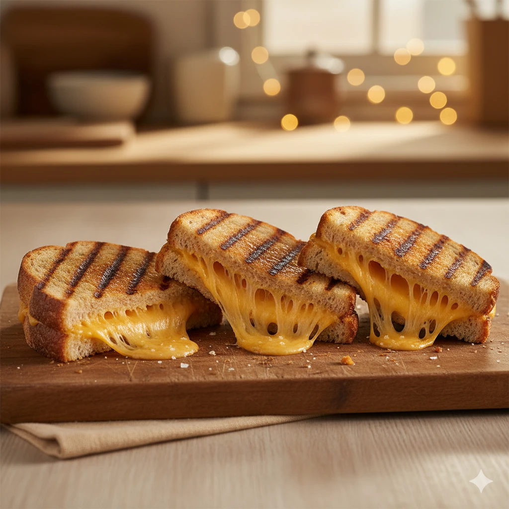 Pan dorado a la parrilla relleno de queso derretido, crujiente por fuera y suave por dentro. Un clásico reconfortante ideal a cualquier hora.