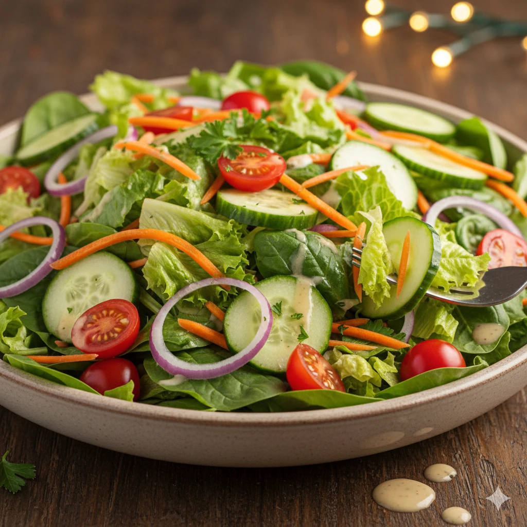 Refrescante mezcla de lechuga, tomate, pepino, zanahoria y aderezo de la casa.