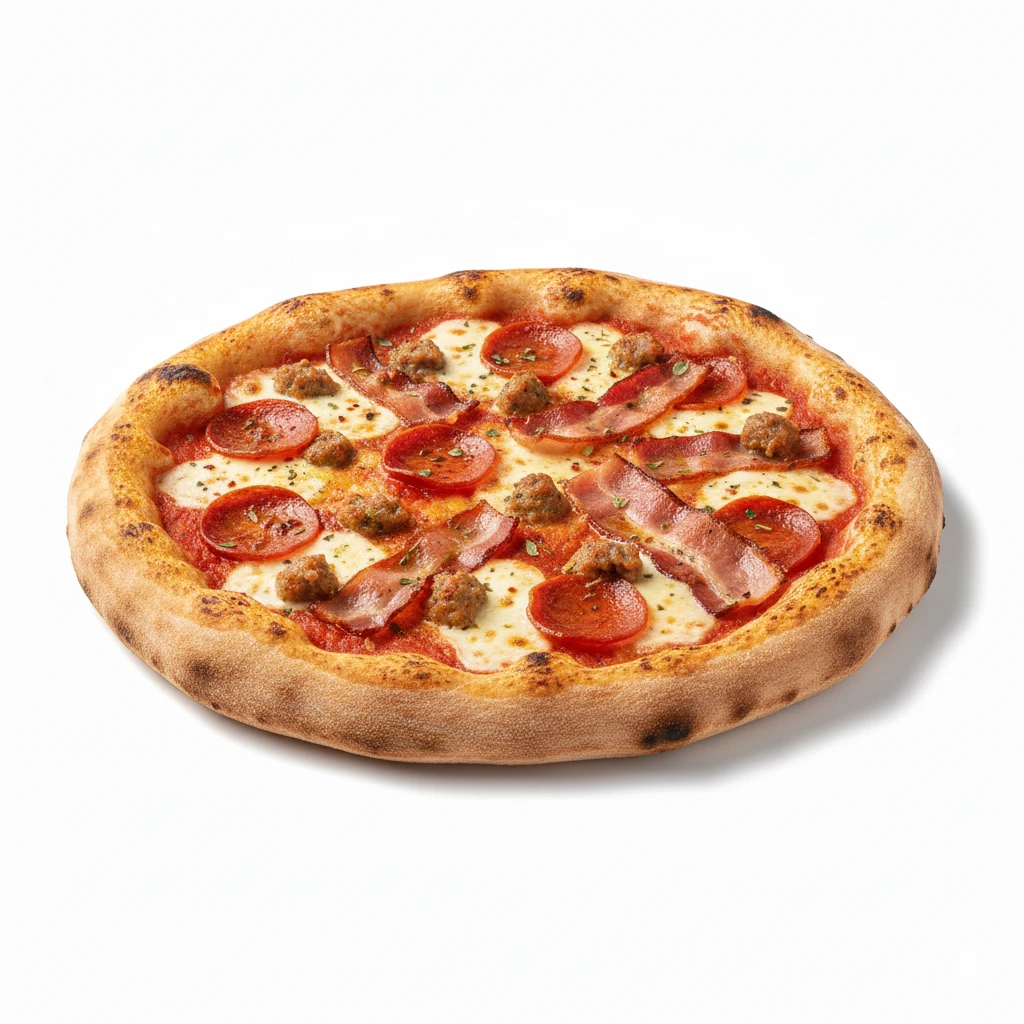 Pizza abundante con pepperoni, salchicha, jamón, carne y queso mozzarella.