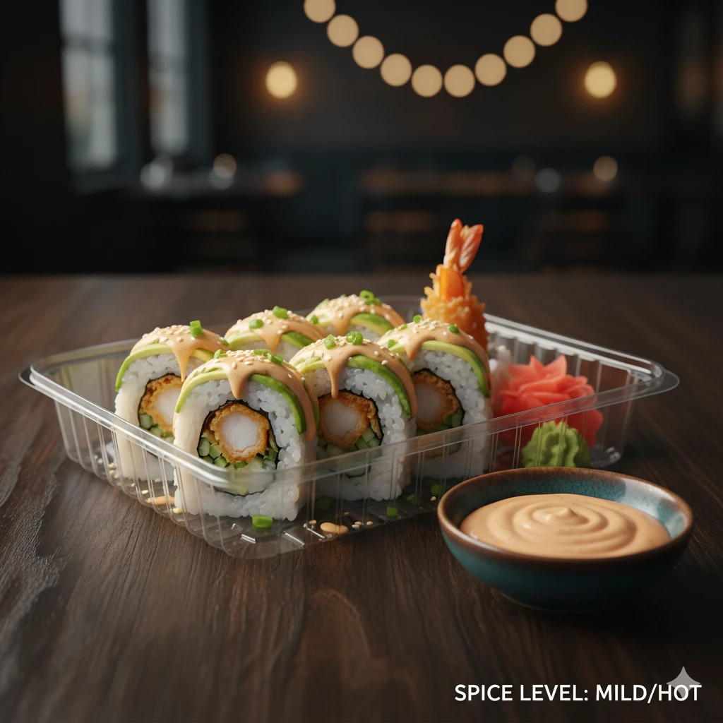 Roll crujiente de camarón tempura con arroz de sushi, alga nori y toppings frescos. Elige tu nivel de picante.