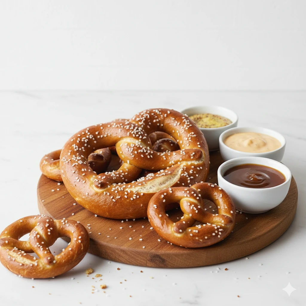 Pretzels suaves y calientes con corteza dorada, acompañados de dip de queso o mostaza.