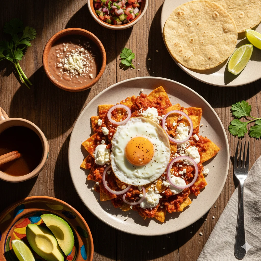 Huevos revueltos acompañados de chilaquiles, frijoles refritos, queso fresco y tortillas hechas a mano.
